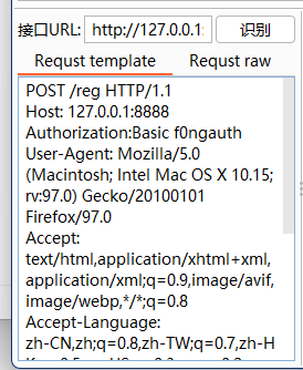 POST /reg HTTP/1.1 Host: 127.0.0.1:8888 Authorization:Basic f0ngauth User-Agent: Mozilla/5.0 (Macintosh; Intel Mac OS X 10.15; rv:97.0) Gecko/20100101 Firefox/97.0 Accept: text/html,application/xhtml+xml,application/xml;q=0.9,image/avif,image/webp,*/*;q=0.8 Accept-Language: zh-CN,zh;q=0.8,zh-TW;q=0.7,zh-HK;q=0.5,en-US;q=0.3,en;q=0.2 Accept-Encoding: gzip, deflate Connection: keep-alive Upgrade-Insecure-Requests: 1 Content-Type: application/x-www-form-urlencoded Content-Length: 8332 <@BASE64><@IMG_RAW></@IMG_RAW></@BASE64>