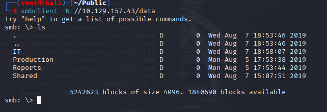 └─# smbclient -N //10.129.157.43/data