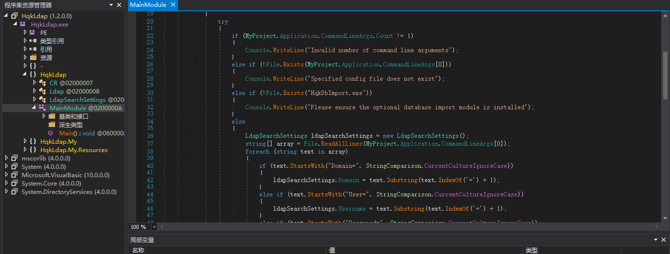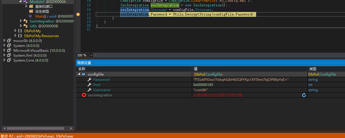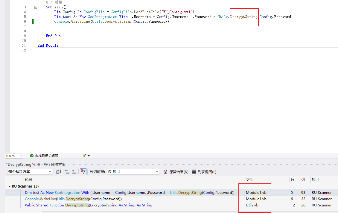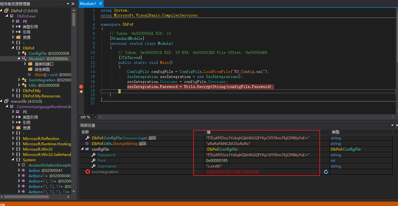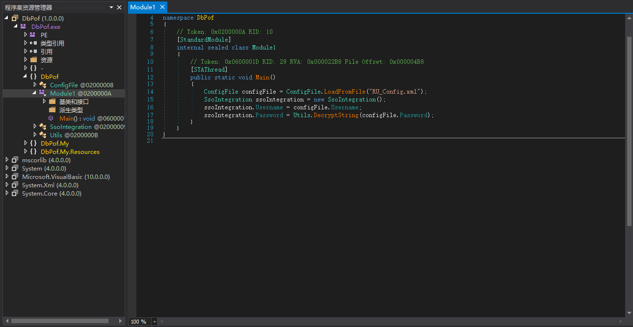 导入 VS 丢丢之后,在 Module1 可以看到是加载了配置文件然后引用 utils 中的 DecryptString 函数进行加解密。